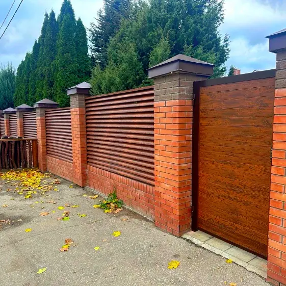 Cовременный забор-жалюзи с ламелями Еврожалюзи в цвете Тёмный Дуб 3D покрытие Принтек двустороннее. Такое решение не только придаёт ограждению элегантный внешний вид с фактурой натурального дерева, но и обеспечивает надежную защиту от внешних воздействий. Конструкция дополнена калиткой из металлопланкена, которая гармонично сочетается с общим дизайном и делает забор практичным и удобным в эксплуатации.